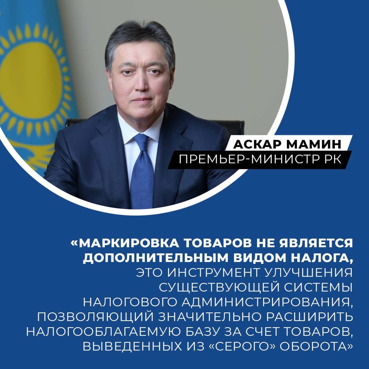 «Согласно международной практике, одним из инструментов по снижению теневого оборота товаров является маркировка товаров. Международный опыт также показывает, что внедрение данного механизма позволяет не только проследить жизненный цикл товаров от производства или ввоза импорта до конечной реализации, но также увеличить поступление налогов в бюджет», - написал Аскар Мамин.